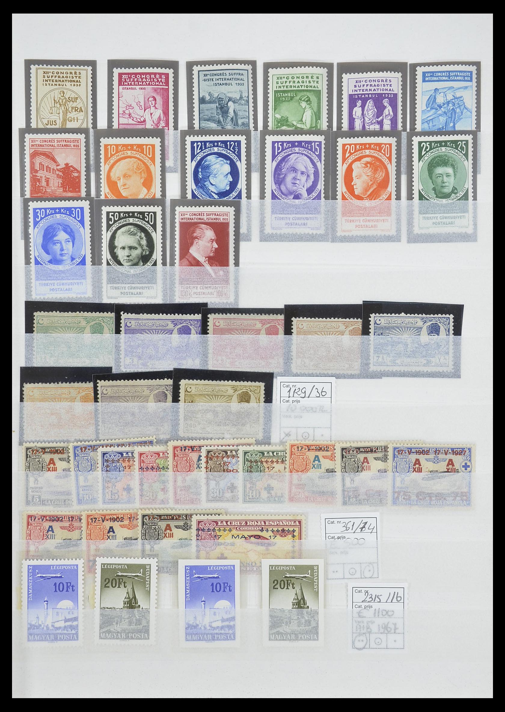 Beautiful lot of expensive stamps and sets of various countries 1900-1955 in mostly beautiful quality in 2 stockbooks, in which very good Turkey (including women’s congress several times including proofs), imperforated Hungary, Italy and territories, Albania, Bulgaria, Spain, Bundespost, Netherlands syncopated, South Africa, Japan, etc. Catalogue value over 43,000 euros!